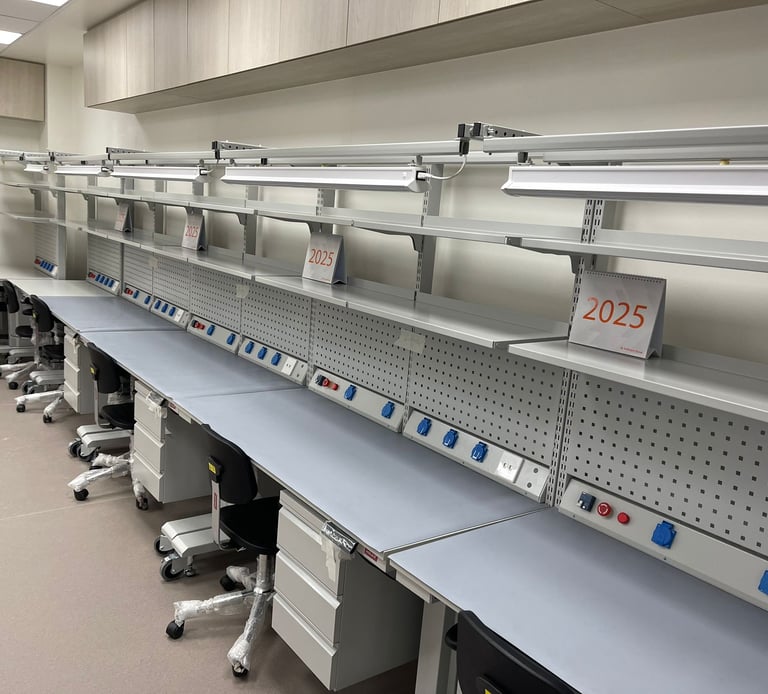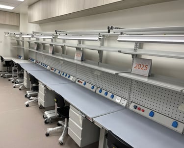 Installed within a leading hospital’s internal R&D and medical device testing lab, this project features our fully integrated ESD-compliant workstation system, tailored for clean, safe, and efficient workflows.