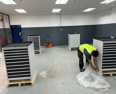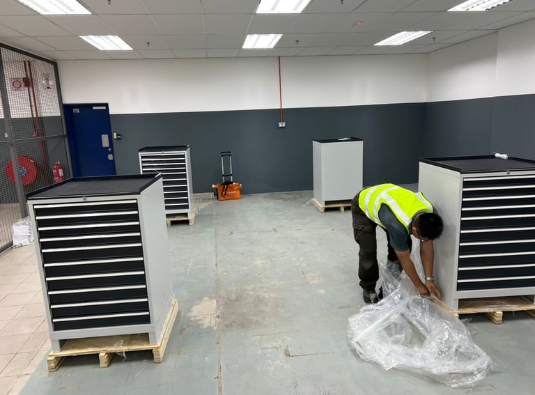 This project involved the bulk delivery and positioning of high-capacity drawer tool cabinets for an industrial client's operations zone.