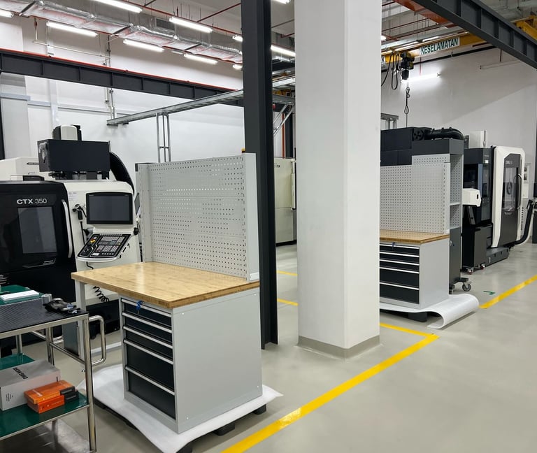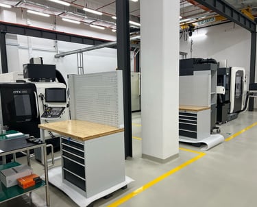 Installed alongside high-precision CNC machines (DMG Mori, CTX 350), our modular workstations support operators with:
